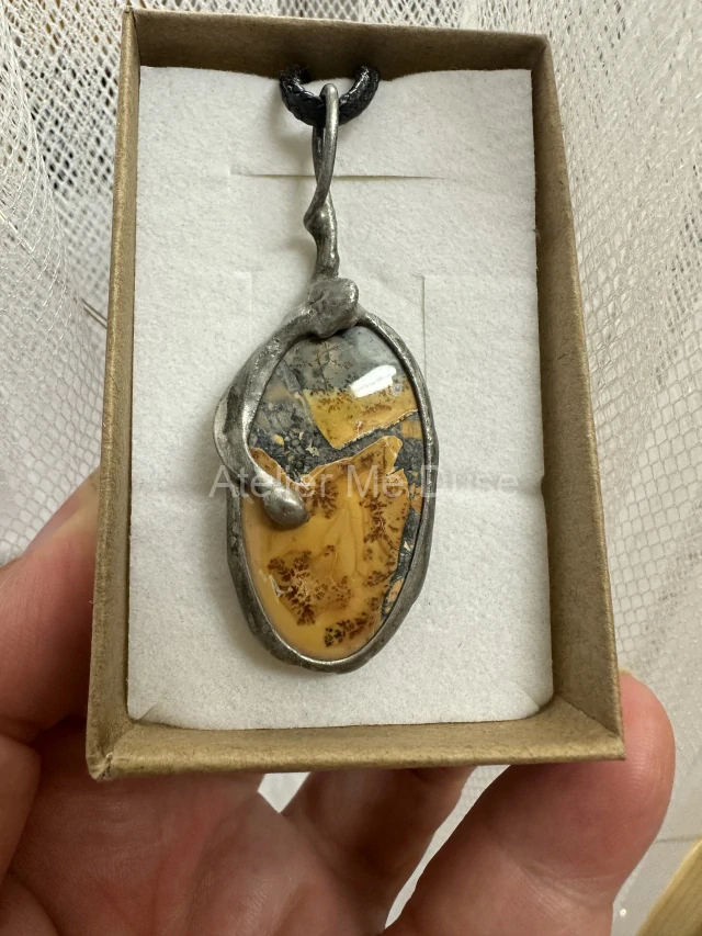Velikost kamene cca 4cm, celý šperk 6cm. Patinovaný, ošetřený antikorozním olejem. Dodáváno k dárkové krabičce.