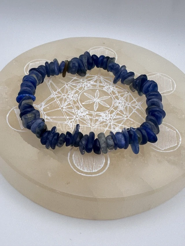 Náramek z přírodního kyanitu je originální minerální šperk vytvořený ze sekaných zlomků kamene v modrých odstínech – od světle šedomodré až po safírovou. Vyznačuje se hedvábným leskem a jemnou vláknitou strukturou.