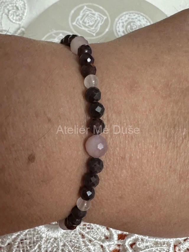 Náramek z broušených korálků granátu, růženínu, křišťálu.