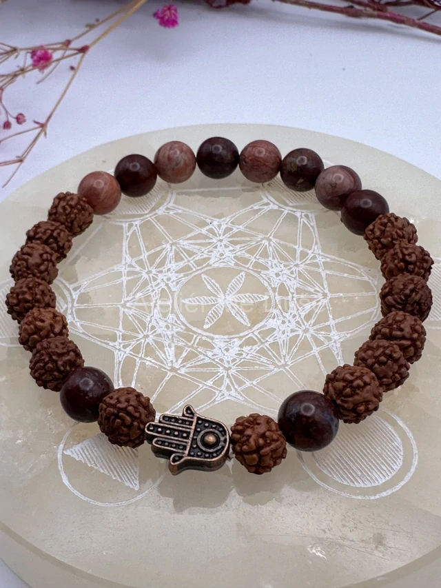 Náramek kombinující přírodní jaspis a posvátná semena rudraksha