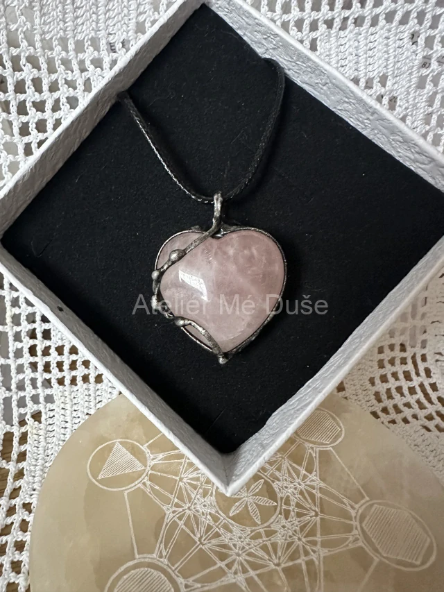 Krásný lesklý růženín vybroušený do tvaru srdce. Tento přívěšek můžete nosit oboustraně.